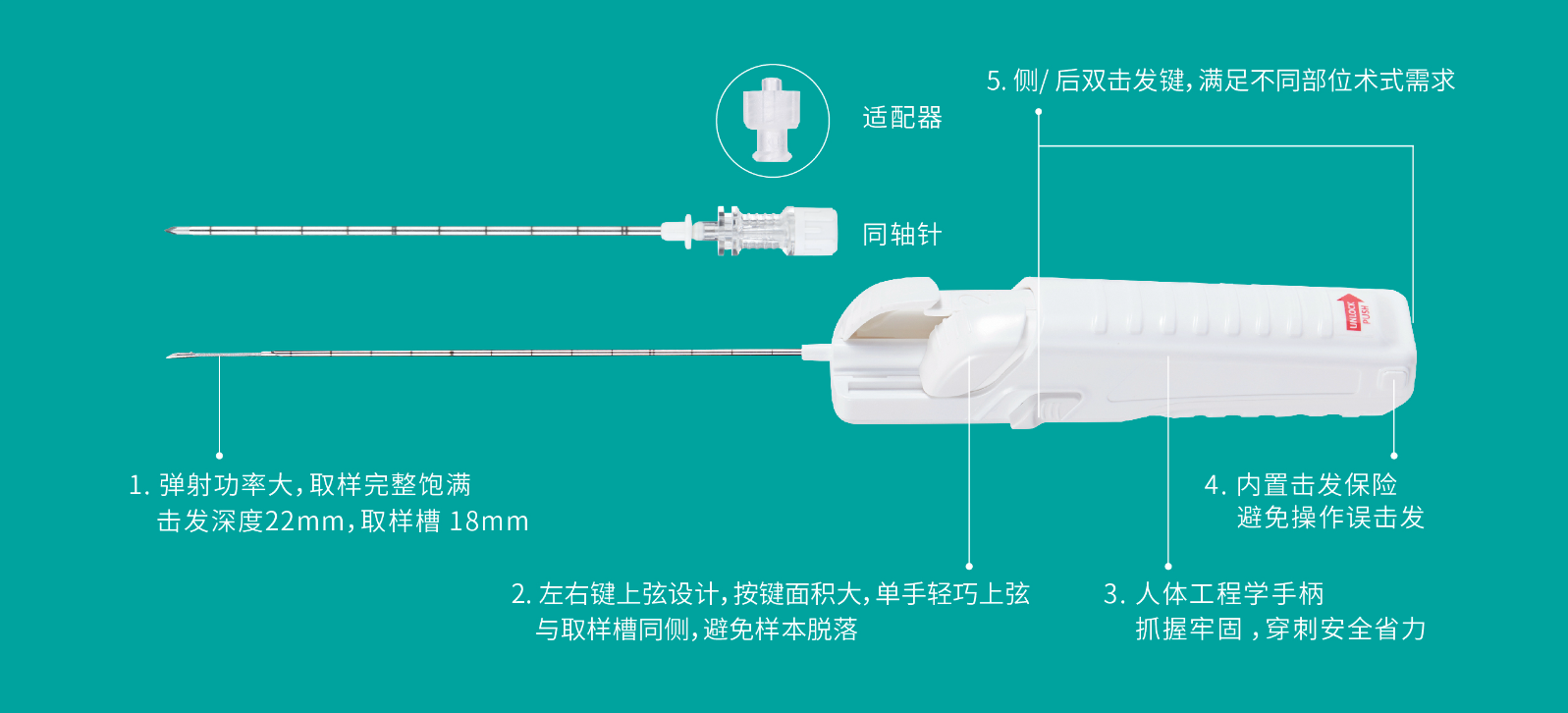 配合同轴引导针使用,一点穿刺,多次取样